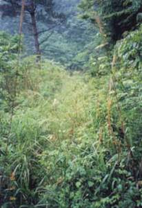 | 決壊した路肩を木材で補強している(連れて行った犬が隙間に落ちた(^^;) | 草をかき分けて進む。ほとんど道とは思えない。